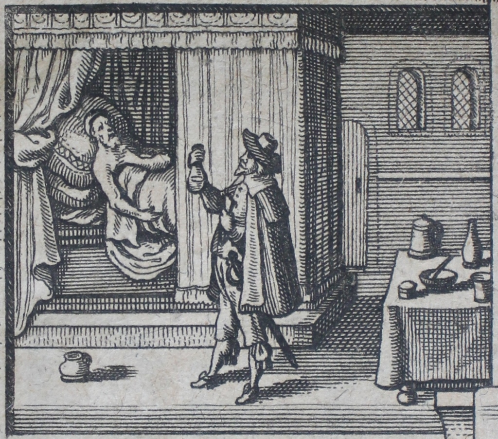 This image of a physician, holding up a matula of urine to the light in order to make a diagnosis and prognosis for his patient, sick in bed at home, is perhaps stereo-typical of our image of early modern practitioners. Uroscopy had been one of the methods employed by physicians since the Middle Ages and it remained a wildly popular diagnostic technique (at least among the general public), and also as a symbol of the medieval physician’s art. As an image it continued to be a signifier for early modern physicians but throughout the period debate increasingly focused on just who was holding the glass and whether he was an academically-educated learned physician, for the early modern period witnessed a challenge to the traditional role of the learned physician, from a number of fronts. Their response may be seen in the rise of colleges of physicians across Europe, which, in effect, were defensive bastions of physicians’ privilege, designed to bolster the practice of medicine by early modern physicians against increasing encroaches by other medical practitioners, who sought to employ not only old techniques such as uroscopy but also new treatments. The challengers included other licensed medical practitioners such as apothecaries, surgeons, ecclesiastically licensed mid-wives, but also unregulated actors, such as women (involved in health care primarily though not exclusively in the home), and un-educated ‘quacks’ or ‘empirics’.[2] With the growth of print and the commoditization of medicines, the early modern medical marketplace became an intellectual battleground between a host of competing practitioners.[3]