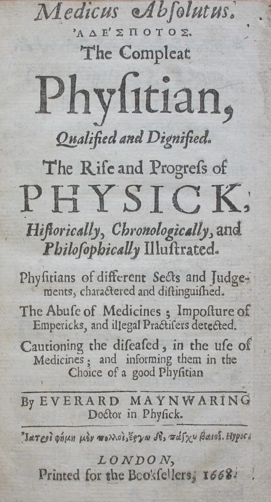 Everard Maynwaring, Medicus absolutus … The compleat physitian, qualified and dignified. The rise and progress of physick, historically, chronologically, and philosophically illustrated. Physitians … charactered and distinguished. The abuse of medicines … and illegal practisers detected. Cautioning the diseased … and informing them in the choice of a good physitian (London, 1668), title page.